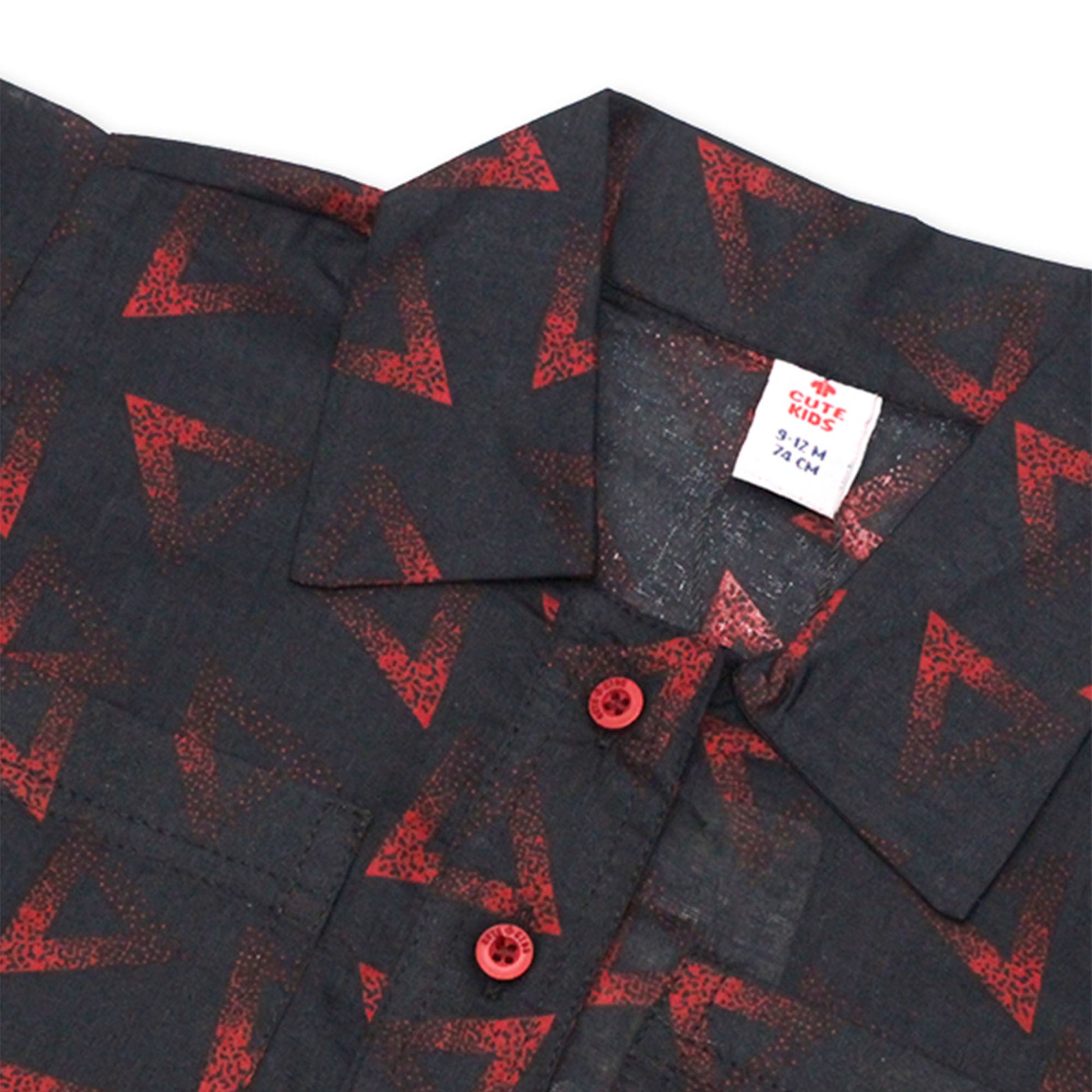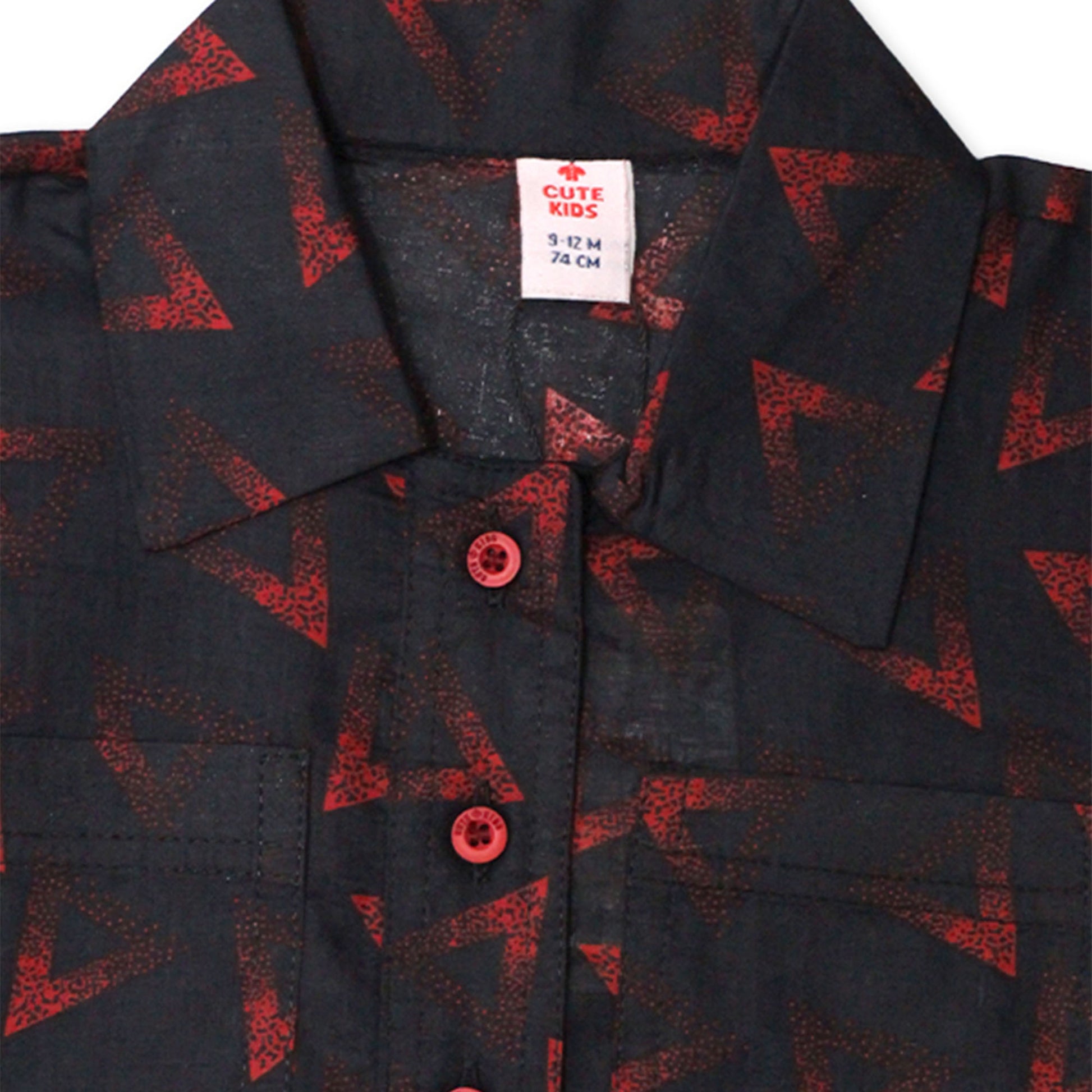 This co-ord set features a black half-sleeve button-down shirt with bold red geometric prints, paired with matching drawstring trousers. Designed for comfort and style — perfect for casual outings, playtime, or everyday wear. 😍